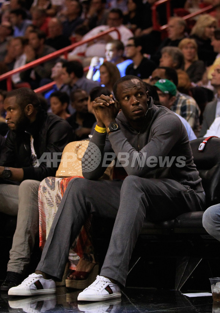 試合観戦に訪れたロンドン五輪陸上男子100メートル、200メートル金メダリストのウサイン・ボルト(Usain Bolt、2012年10月30日撮影)。(c)AFP/Getty Images/Chris Trotman