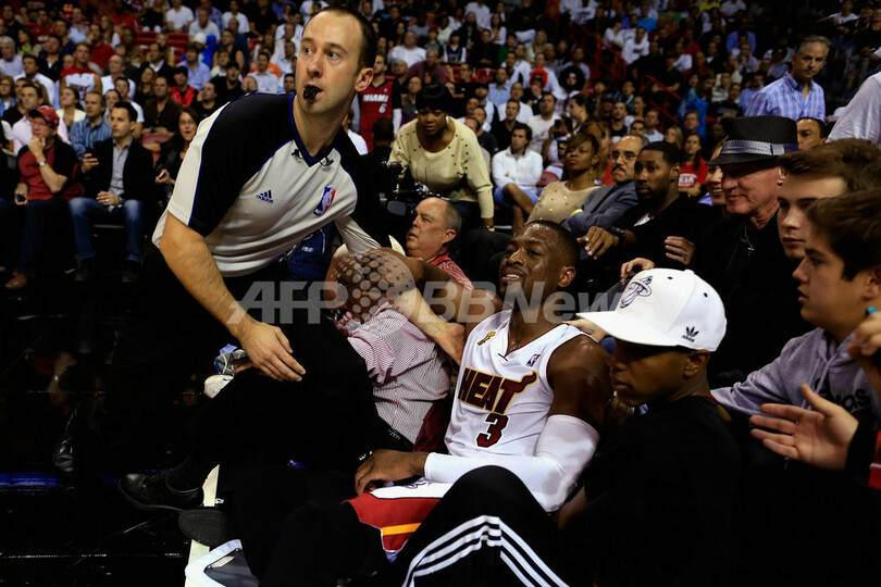 カメラマン席へ倒れこむマイアミ・ヒートのドウェイン・ウェイド(Dwyane Wade、中央右、2012年10月30日撮影)。(c)AFP/Getty Images/Chris Trotman