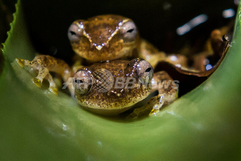 写真は、学名Endropsophus berthalutzaeのつがい(10月23日撮影)。(c)AFP/Yasuyoshi CHIBA