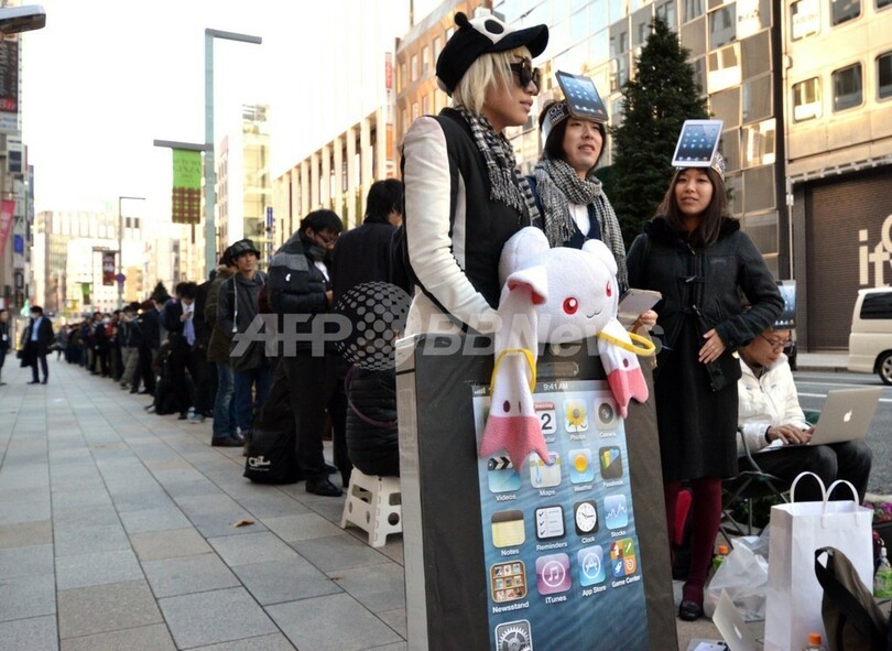 写真は、都内のアップルストア前で「iPad Mini」を購入するため並ぶ人々(2012年11月2日撮影)。(c)AFP/Yoshikazu TSUNO