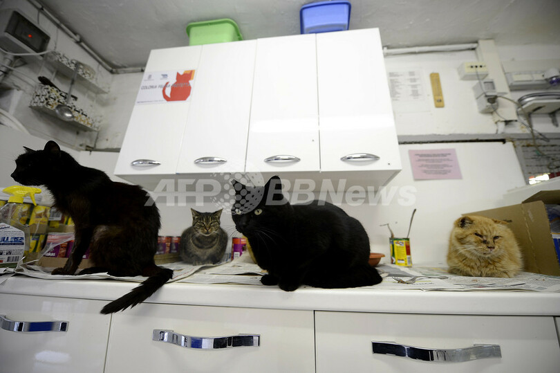 これに対し考古学当局側は、「一掃」するのは遺跡に中に無断で作られた建造物であってネコではないと声明を発表し、NPOの懸念の払拭をはかった。写真は、「アルジェンティーナ広場のネコ・コロニー」本部内でくつろぐネコたち(2012年10月30日撮影)。(c)AFP/Filippo MONTEFORTE