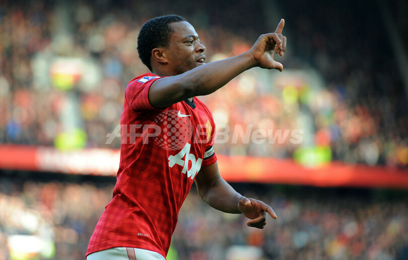 後半22分に追加点を決め喜ぶマンチェスター・ユナイテッドのパトリス・エヴラ(Patrice Evra、2012年11月3日撮影)。(c)AFP/ANDREW YATES