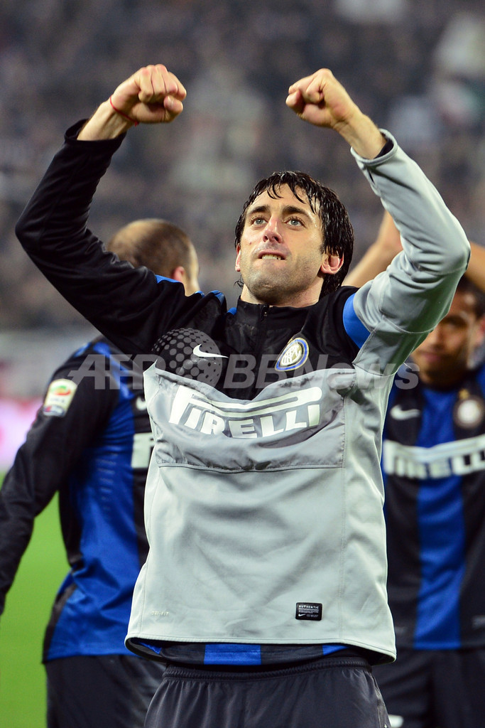 勝利を喜ぶインテルのディエゴ・ミリート(Diego Milito、2012年11月3日撮影)。(c)AFP/GIUSEPPE CACACE