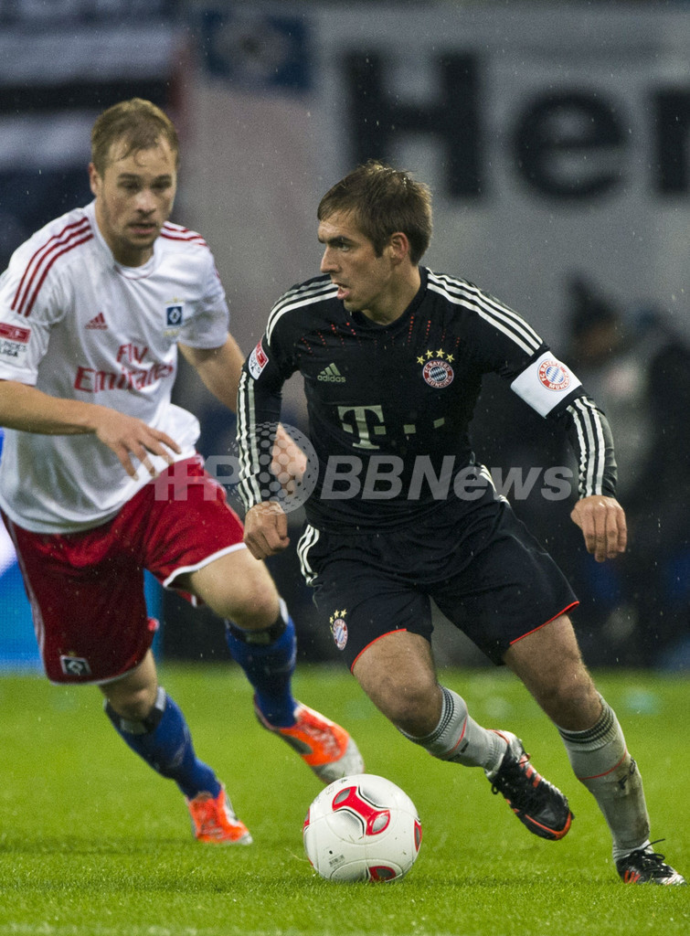 ハンブルガーSVのマクシミリアン・バイスター( Maximilian Beister、左)の前でボールをコントロールするバイエルン・ミュンヘンのフィリップ・ラーム(Philipp Lahm、2012年11月3日撮影)。(c)AFP/JOHN MacDOUGALL