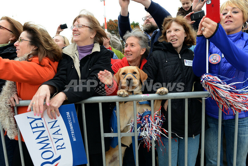 写真はニューハンプシャー(New Hampshire)州ニューイントン(Newington)のポーツマス国際空港(Portsmouth International Airport)に集まったロムニー氏の支持者ら(2012年11月3日撮影)。(c)AFP/Emmanuel DUNAND