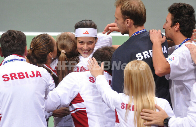 試合に勝利し、チームメイトと歓喜するセルビアのアナ・イワノビッチ(中央、2012年11月4日撮影)。(c)AFP/MICHAL CIZEK