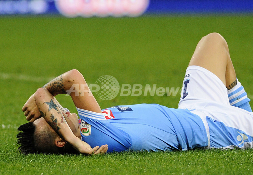 試合終了後、ピッチに横たわるナポリのマレク・ハムシク(Marek Hamsik、2012年11月5日撮影)。(c)AFP/ROBERTO SALOMONE