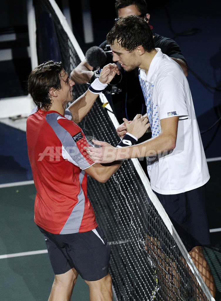 ネットを挟んで健闘を称えあうイェジ・ヤノヴィッツ(右)とダビド・フェレール(2012年11月4日撮影)。(c)AFP/LIONEL BONAVENTURE