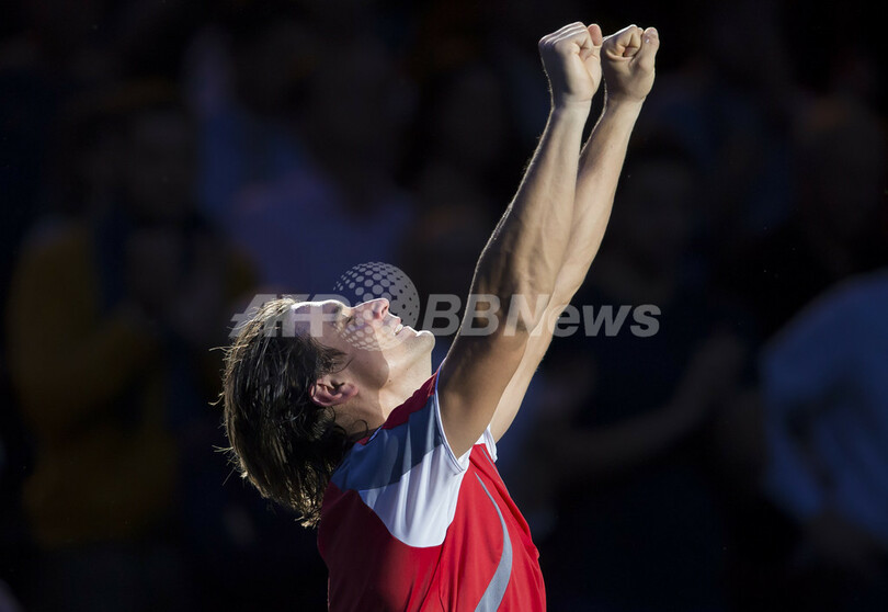 優勝を決め歓喜するダビド・フェレール(2012年11月4日撮影)。(c)AFP/IAN LANGSDON
