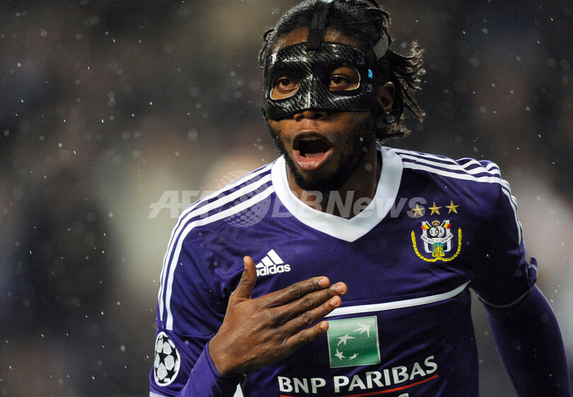 前半17分に得点を決め歓喜するRSCアンデルレヒトのデュメルシ・エムボカニ(Dieumerci Mbokani、2012年11月6日撮影)。(c)AFP/JOHN THYS