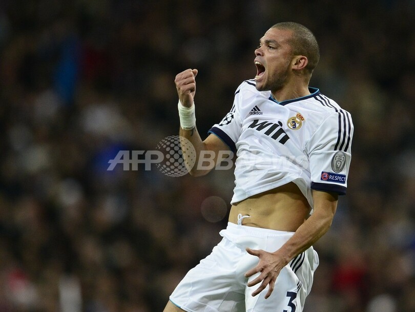 前半34分に同点ゴールを決め、歓喜するレアル・マドリードのペペ(Pepe、2012年11月6日撮影)。(c)AFP/JAVIER SORIANO