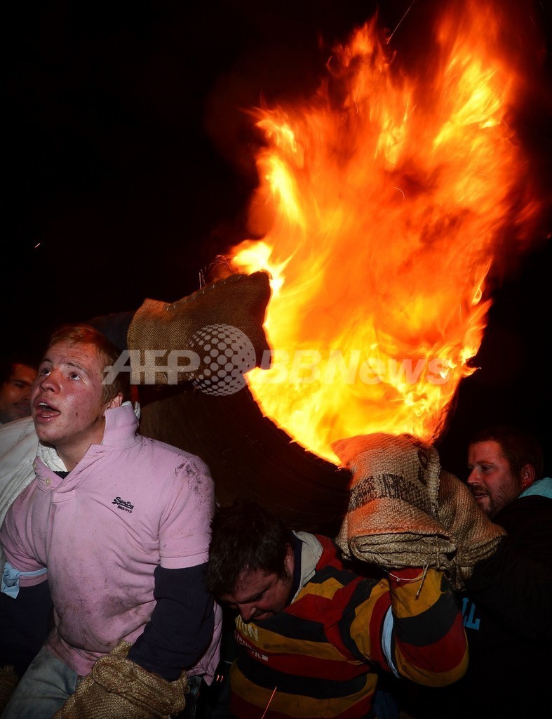 【11月6日 AFP】英イングランド南西部デボン(Devon)州の町オテリー・セントメリー(Ottery St Mary)で5日、燃え盛るたるを担いで町内を駆け抜ける競技「タール・バレルズ(Tar Barrels)」が開かれた。