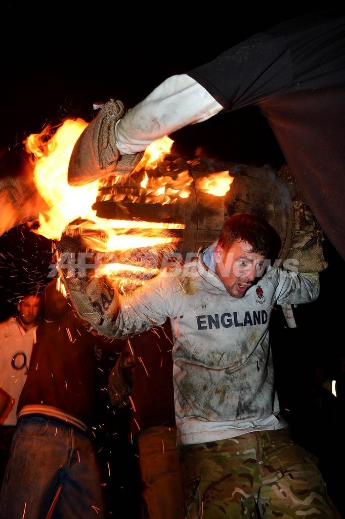 木製のたるはあらかじめタールに漬け込まれており、火をつけて燃えるたるを担ぎ、どれだけの時間走り続けられるか競う。毎年11月5日に行われる「タール・バレルズ」は起源を17世紀までさかのぼり、たるを担ぐことができるのはオテリー・セントメリーで生まれた人だけと決められている。(c)AFP