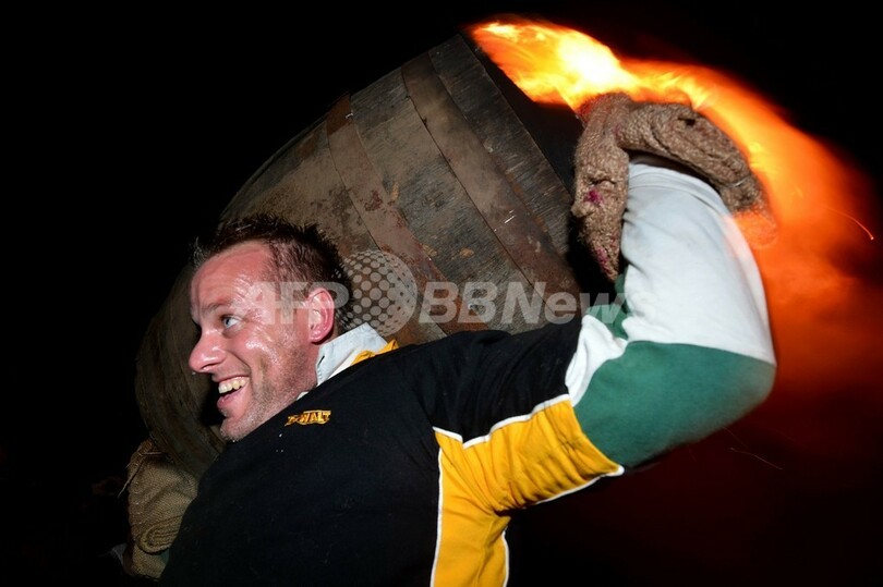 木製のたるはあらかじめタールに漬け込まれており、火をつけて燃えるたるを担ぎ、どれだけの時間走り続けられるか競う。毎年11月5日に行われる「タール・バレルズ」は起源を17世紀までさかのぼり、たるを担ぐことができるのはオテリー・セントメリーで生まれた人だけと決められている。(c)AFP