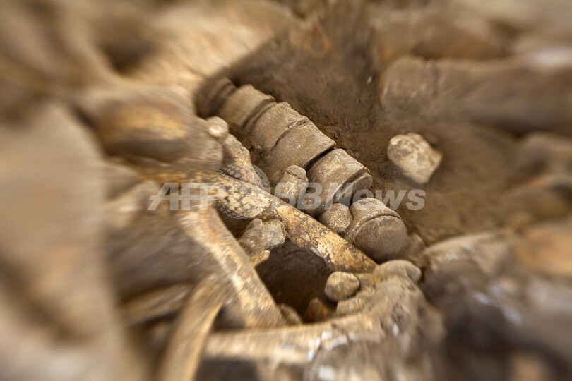 写真は、シャン・シュル・マルヌの発掘現場で撮影されたマンモスの骨(2012年11月6日撮影)。(c)AFP/LOIC VENANCE
