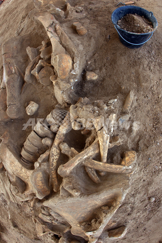 写真は、シャン・シュル・マルヌの発掘現場で撮影されたマンモスの骨(2012年11月6日撮影)。(c)AFP/LOIC VENANCE