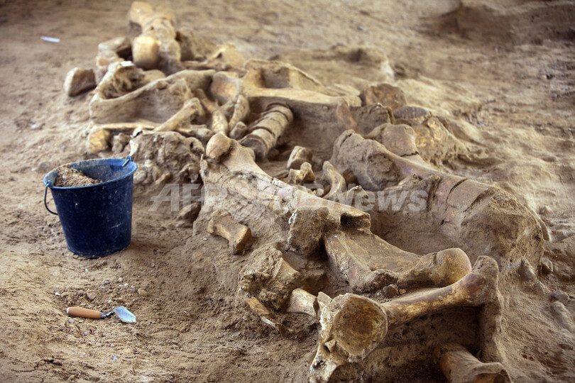 写真は、シャン・シュル・マルヌの発掘現場で撮影されたマンモスの骨(2012年11月6日撮影)。(c)AFP/LOIC VENANCE