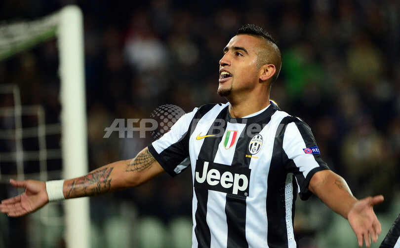 前半23分に得点を挙げ歓喜するユベントスのアルトゥーロ・ビダル(Arturo Vidal、2012年11月7日撮影)。(c)AFP/OLIVIER MORIN