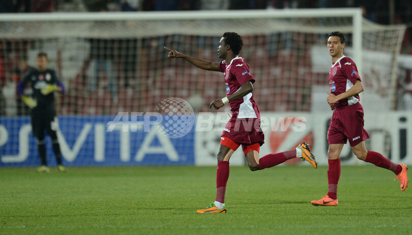 得点を決めて喜ぶCFRクルージュのモドゥー・スグー(Modou Sougou、中央、2012年11月7日撮影)。(c)AFP/DANIEL MIHAILESCU