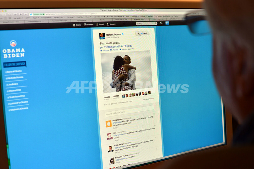 【11月8日 AFP】大統領選で再選を決めたバラク・オバマ(Barack Obama)大統領は7日、ソーシャルメディア上でも新たな歴史を刻んだ。