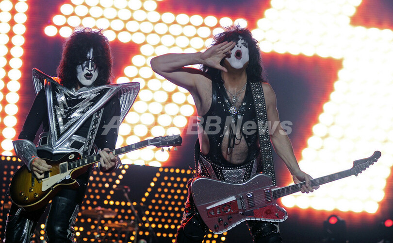 写真は、 トミー・セイヤー(Tommy Thayer、左)とポール・スタンレー(Paul Stanley、2012年11月7日撮影)。(c)AFP/Alejandro PAGNI