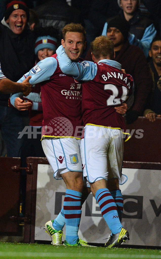 後半5分にチームの2得点目を決め、チームメイトのバリー・バナン(Barry Bannan)に祝福されるアストン・ビラのアンドレアス・ヴァイマン(Andreas Weimann、2012年11月10日撮影)。(c)AFP/ANDREW YATES