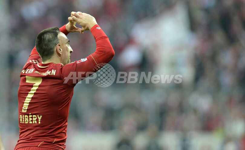 得点を挙げて喜ぶバイエルン・ミュンヘンのフランク・リベリ(Franck Ribery、2012年11月10日撮影)。(c)AFP/CHRISTOF STACHE