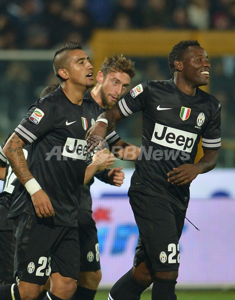 前半9分に先制点を決め、チームメイトのクワドォー・アサモア(Kwadwo Asamoah、右)、クラウディオ・マルキジオ(Claudio Marchisio、中央)らから祝福されるユベントスのアルトゥーロ・ビダル(Arturo Vidal、2012年11月10日撮影)。(c)AFP/ALBERTO PIZZOLI