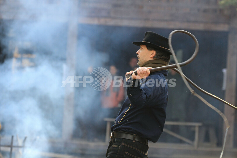 地元チェコやスロバキアなどの近隣諸国から集まった参加者らは、米西部開拓時代のカウボーイになりきり、銃さばきやムチさばき、ナイフ投げや斧投げの技を競った。(c)AFP