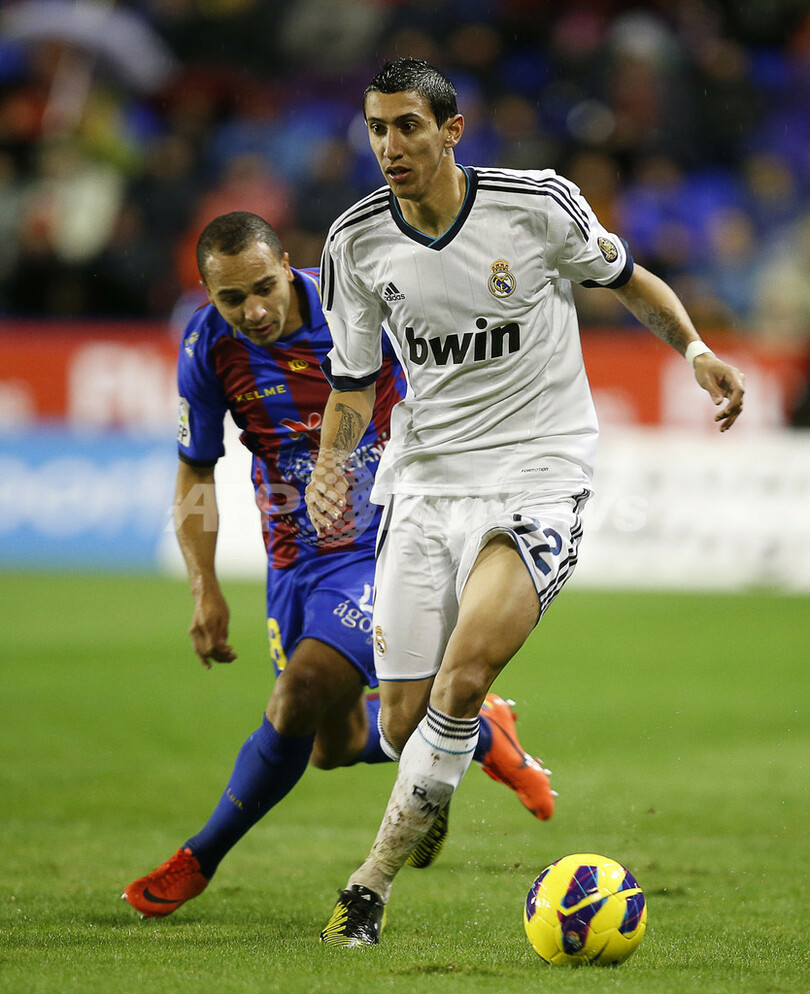レバンテのナビル・エル・ザハル(Nabil El Zhar、左)のマークを受けるレアル・マドリードのアンヘル・ファビアン・ディ・マリア(Angel Fabian Di Maria、2012年11月11日撮影)。(c)AFP/JOSE JORDAN