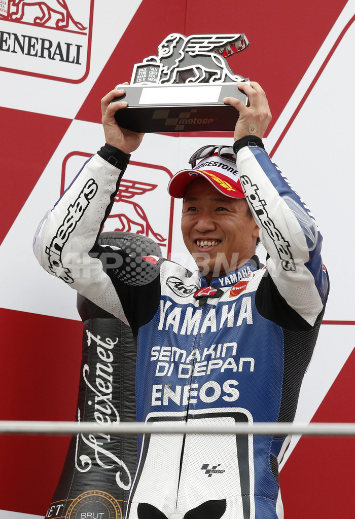 2位に入り、表彰台でトロフィーを掲げるヤマハ・ファクトリーの中須賀克行(Katsuyuki Nakasuga、2012年11月11日撮影)。(c)AFP/JOSE JORDAN