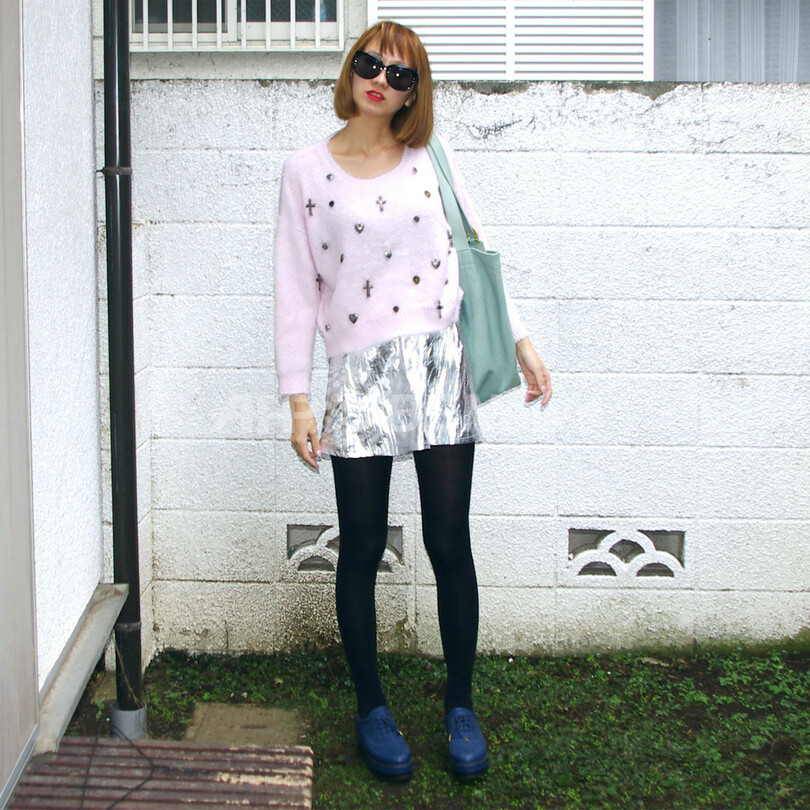クロスのビジューが個性的なNomineのニットは、以前ニット特集でもご紹介したアイテムです。シルバーのスカートには、まずはシルバーモチーフのアイテムを・・・ということでチョイスしてみました!足元はスニーカーでも◎です!!