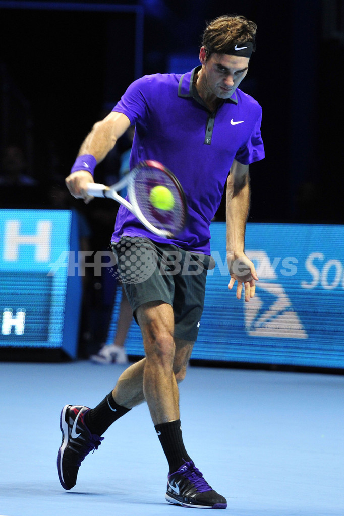 リターンを打つロジャー・フェデラー(2012年11月12日撮影)。(c)AFP/GLYN KIRK