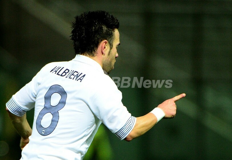 前半37分に同点弾を決めて喜ぶフランスのマチュー・ヴァルブエナ(Mathieu Valbuena、2012年11月14日撮影)。(c)AFP/OLIVIER MORIN