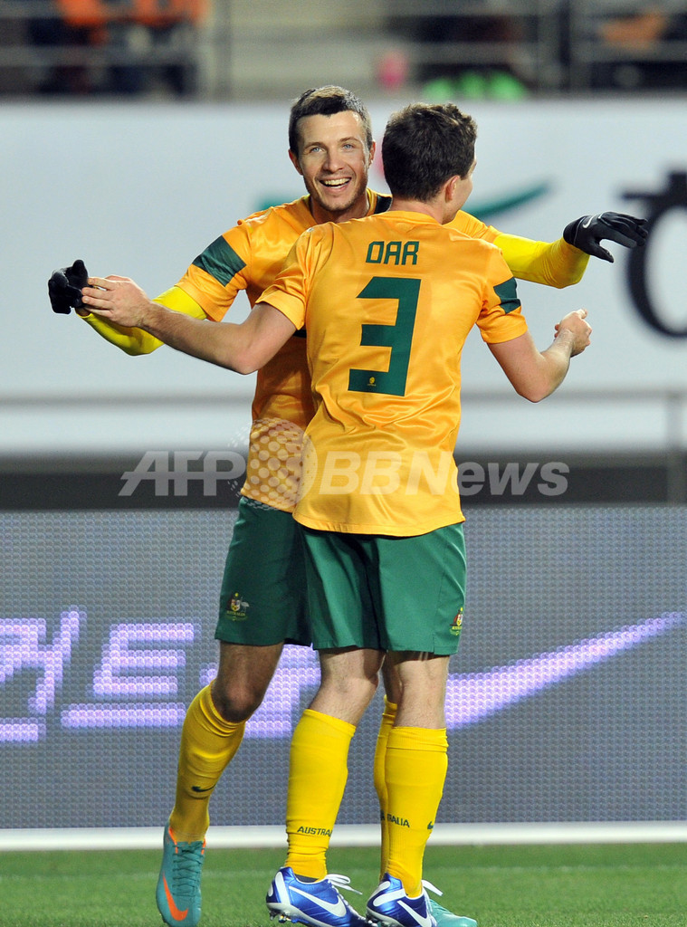 前半43分に同点ゴールを挙げ、チームメイトのトミー・オアー(Tommy Oar)と喜ぶオーストラリアのニキタ・ルカビチャ(Nikita Rukavytsya、2012年11月14日撮影)。(c)AFP/JUNG YEON-JE