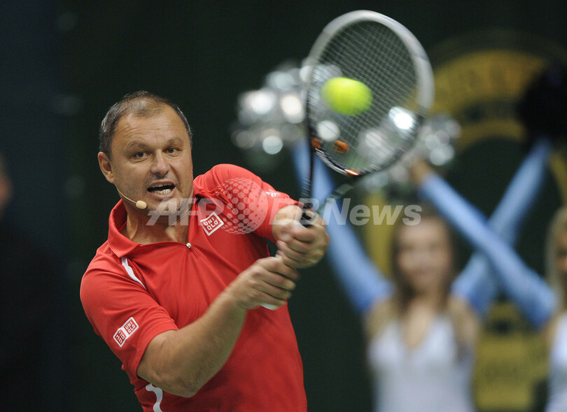 リターンを打つノバク・ジョコビッチのコーチ、マリアン・ヴァイダ(Marian Vajda)氏(2012年11月14日撮影)。(c)AFP/SAMUEL KUBANI