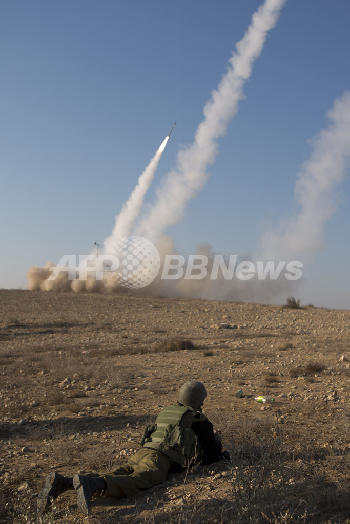 写真は、イスラエル側のベエルシェバ(Beer Sheva)からガザ地区に向けて発射されたミサイル弾(2012年11月15日撮影)。(c)AFP/MENAHEM KAHANA