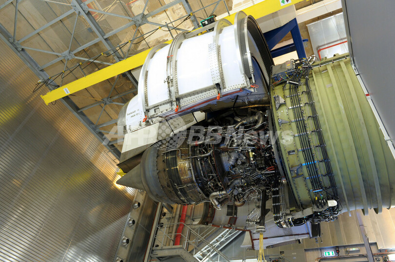 写真は、この設備に持ち込まれた米ゼネラル・エレクトリック(General Electric)製のエンジンGE90-94。このエンジンは米ボーイング(Boeing)のB777型機に搭載される(2012年11月15日撮影)。(c)AFP/ERIC PIERMONT