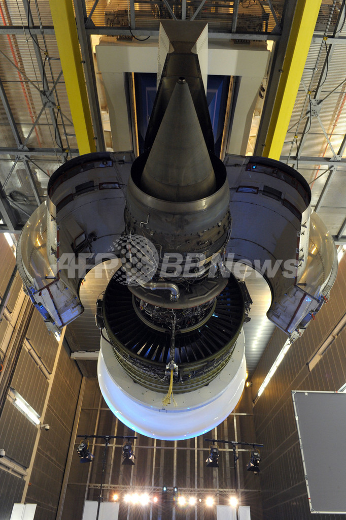 写真は、この設備に持ち込まれた米ゼネラル・エレクトリック(General Electric)製のエンジンGE90-94。このエンジンは米ボーイング(Boeing)のB777型機に搭載される(2012年11月15日撮影)。(c)AFP/ERIC PIERMONT