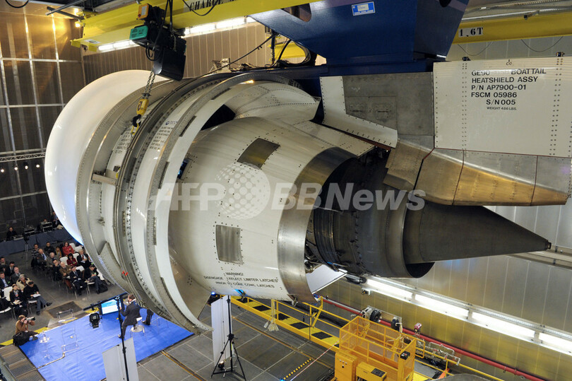 写真は、この設備に持ち込まれた米ゼネラル・エレクトリック(General Electric)製のエンジンGE90-94。このエンジンは米ボーイング(Boeing)のB777型機に搭載される(2012年11月15日撮影)。(c)AFP/ERIC PIERMONT