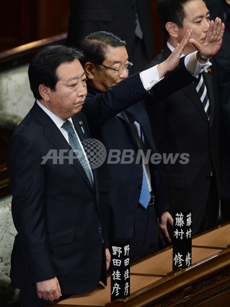 民主党は2009年の総選挙で自民党(Liberal Democratic Party)の長期政権を破り日本のかじ取りを担うことになったが、首相交代が相次ぎ、現在の野田佳彦(Yoshihiko Noda)首相は3人目。2006年の小泉純一郎(Junichiro Koizumi)元首相退任後の自民党時代から数えれば6人目となる。(c)AFP