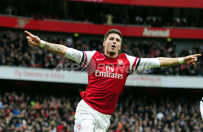 前半ロスタイムにチームの3点目を挙げ、歓喜するアーセナルのオリヴィエ・ジルー(Olivier Giroud、2012年11月17日撮影)。(c)AFP/GLYN KIRK