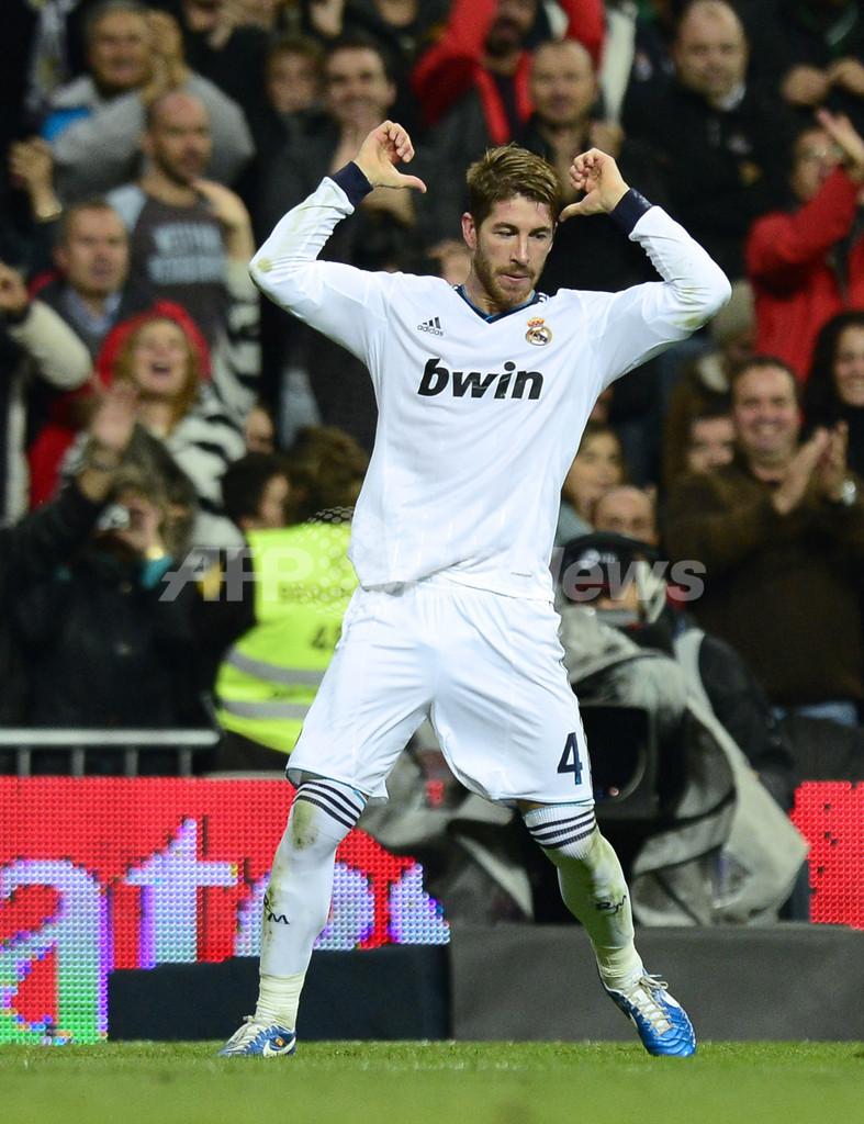 前半30分に追加点を挙げ歓喜するレアル・マドリードのセルヒオ・ラモス(Sergio Ramos、2012年11月17日撮影)。(c)AFP/JAVIER SORIANO