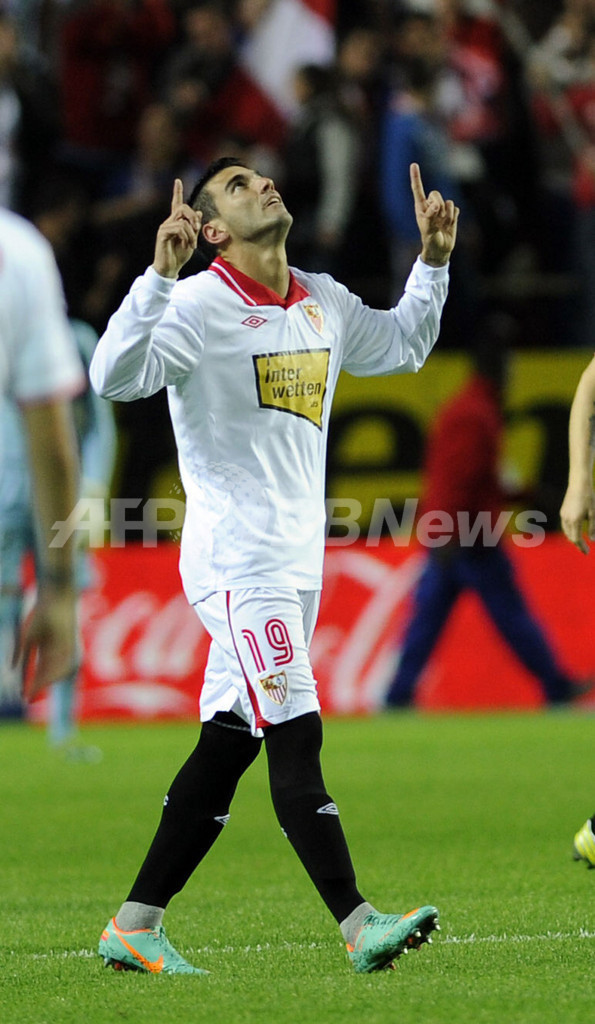 ゴールを挙げ、天に指差して喜ぶセビージャのホセ・アントニオ・レイェス(Jose Antonio Reyes、2012年11月18日撮影)。(c)AFP/CRISTINA QUICLER