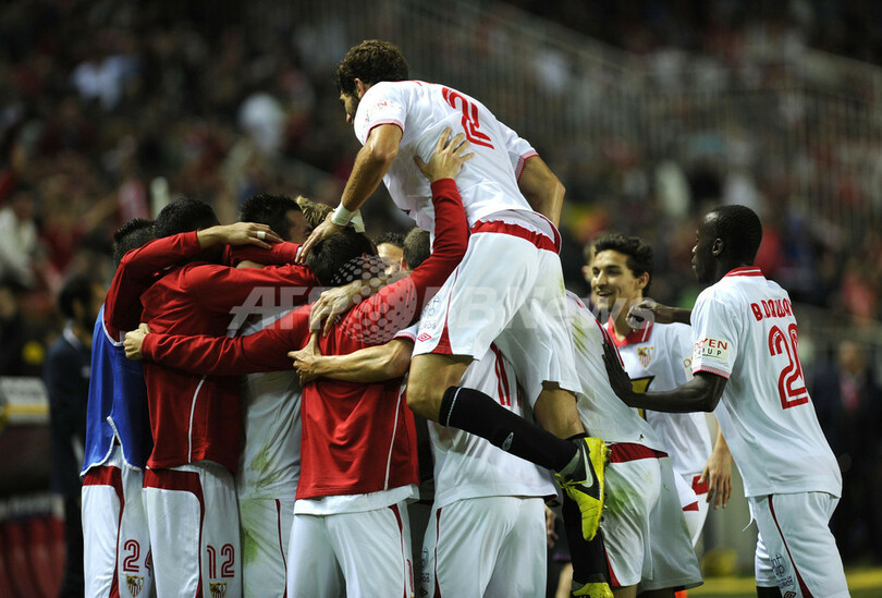 得点を喜ぶセビージャの選手(2012年11月18日撮影)。(c)AFP/CRISTINA QUICLER