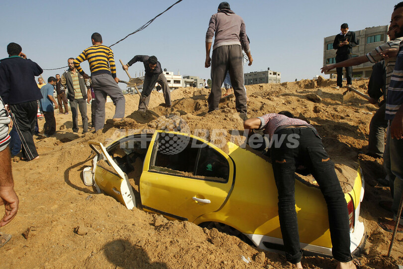 写真はガザ地区北部ベイトラヒヤ(Beit Lahia)で、イスラエル軍の空爆で埋もれた車両に閉じ込められた人の救助にあたる人々(2012年11月15日撮影)。(c)AFP/MOHAMMED ABED
