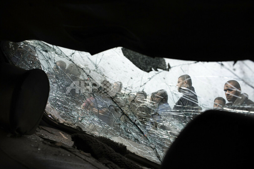 写真はガザ地区ガザ市(Gaza city)内のパレスチナ人避難民キャンプで、空爆で大破した車両内から撮影された住民ら(2012年11月18日撮影)。(c)AFP/MARCO LONGARI