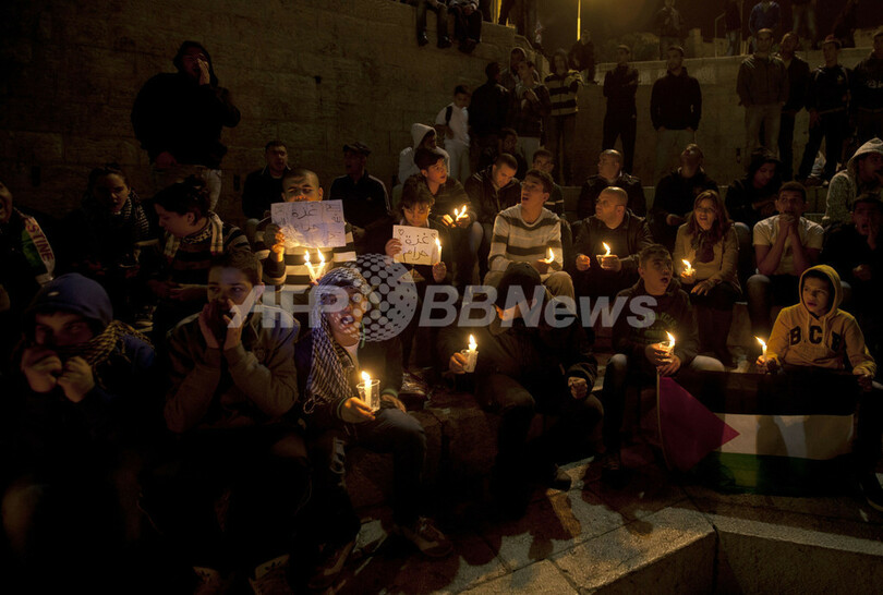 写真はエルサレム(Jerusalem)旧市街にあるダマスカス門(Damascus Gate)で、イスラエル軍によるガザ地区空爆に抗議するパレスチナの人々(2012年11月18日撮影)。(c)AFP/AHMAD GHARABLI