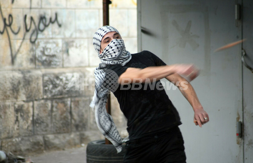 写真はパレスチナ自治区ヨルダン川西岸(West Bank)のヘブロン(Hebron)で、ユダヤ人入植地を警備するイスラエル軍兵士に投石するパレスチナ人男性(2012年11月18日撮影)。(c)AFP/HAZEM BADER