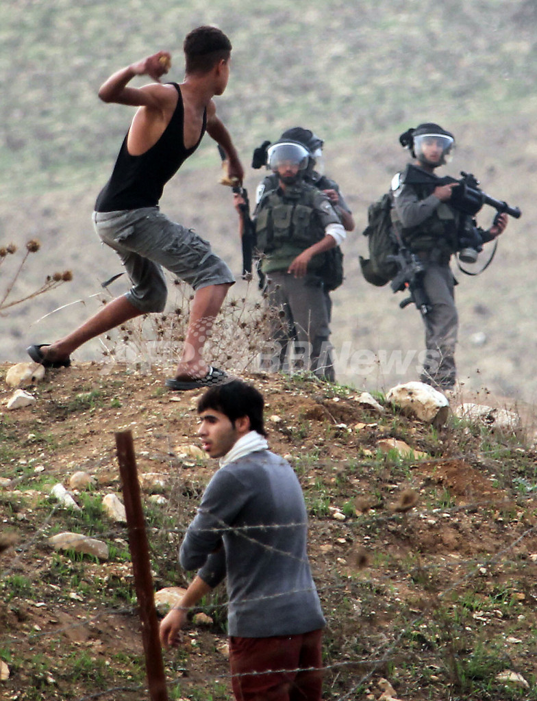 写真はパレスチナ自治区ヨルダン川西岸(West Bank)ナブルス(Nablus)で、イスラエル軍兵士に向けて投石するパレスチナ人の若者(2012年11月18日撮影)。(c)AFP/JAAFAR ASHTIYEH